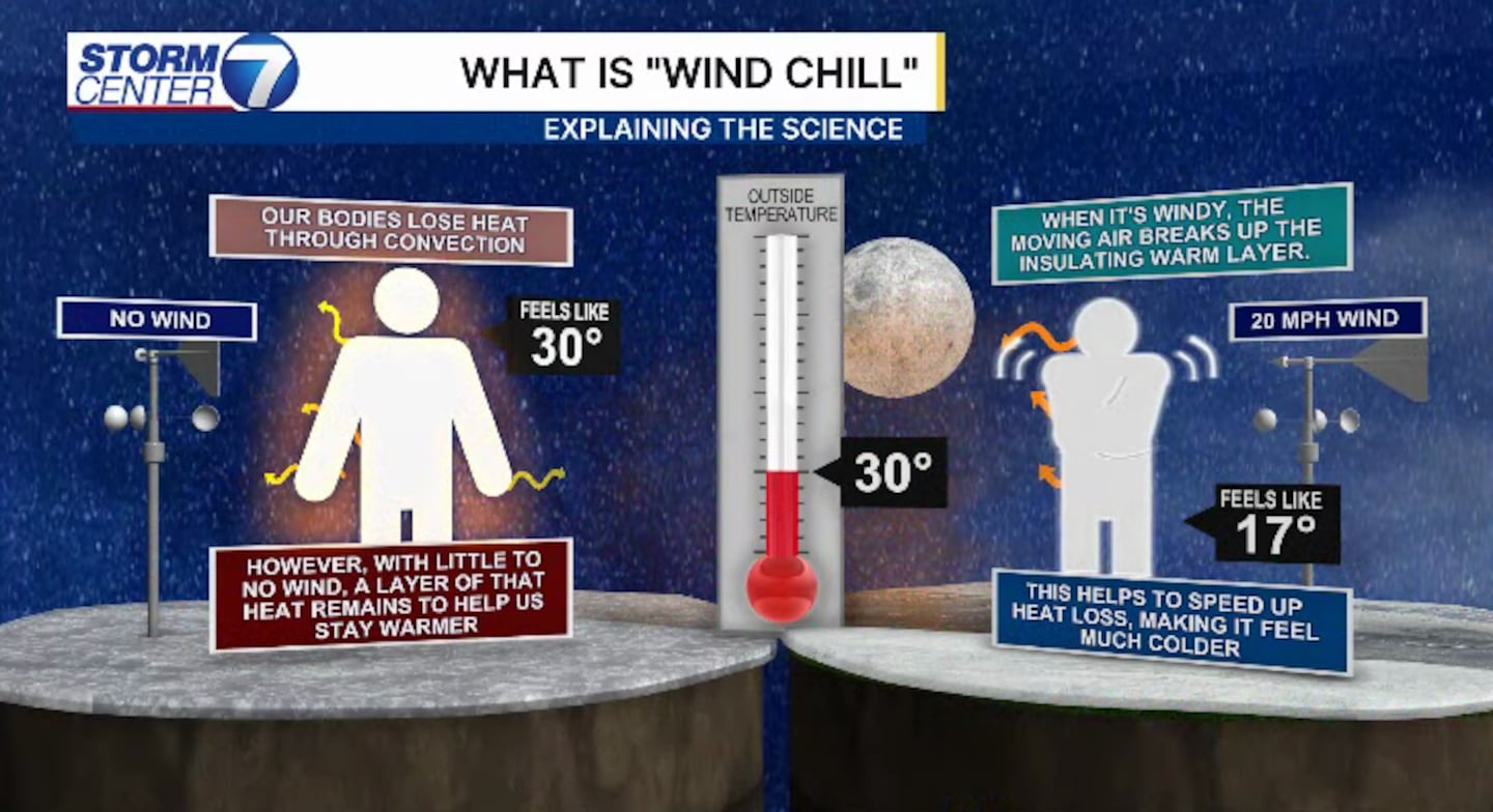 On the flip side, if you add in some wind we find some changes. Wind takes that same layer of heat and breaks it up. This allows for our bodies to speed up the loss of heat and it feels much colder as a result.