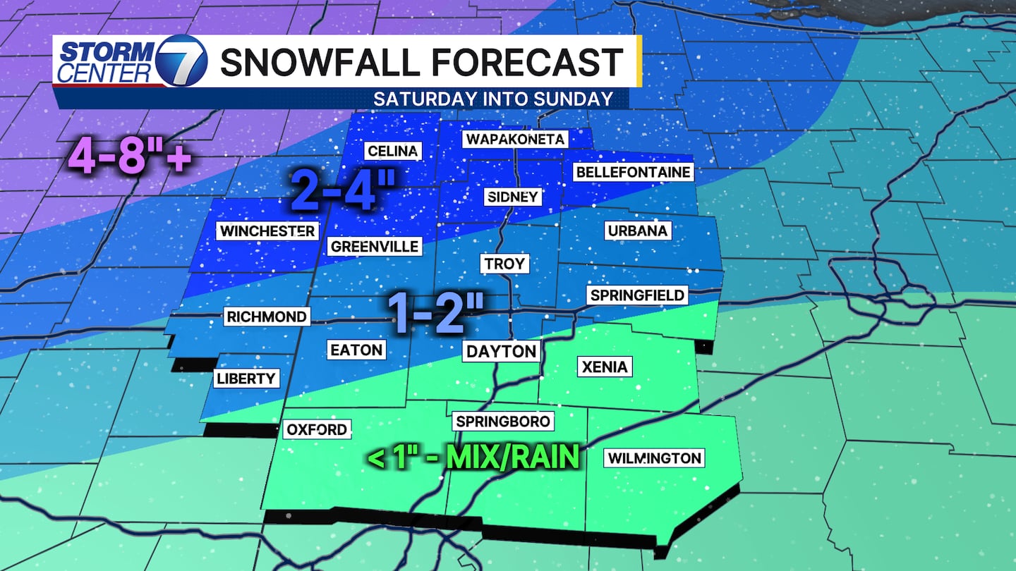 TIMELINE: Snow is likely to move in Saturday afternoon into Saturday evening. The heaviest snow will occur Saturday evening into the very early morning hours on Sunday. Some warmer air will get pushed northward and allow for a mix of rain and snow or a changeover to all rain for parts of the Miami Valley into Sunday morning.